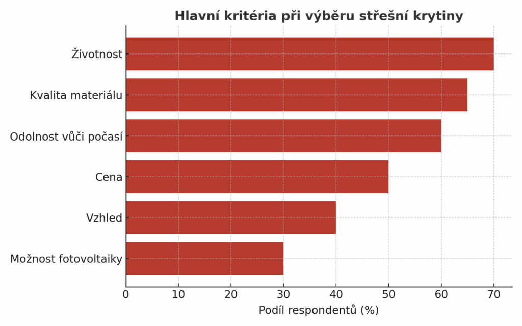 Podle průzkumu kladou Češi při výběru střechy největší důraz na životnost, odolnost a kvalitu. Krytina by měla bez problémů zvládat mráz, déšť i silný vítr po desítky let a přitom nevyžadovat složitou údržbu. Na životnost má velký vliv také prostředí, ve kterém se dům nachází. V horských a podhorských oblastech musí střecha odolat vysoké sněhové zátěži a mrazu, ve větrných lokalitách je nutná krytina odolná vůči nadzvednutí větrem a v zastíněných místech zase čelí vyšší vlhkosti a riziku vzniku mechů či lišejníků. „Střešní tašky vydrží i mnohem vyšší zátěž krup, než jaká se v Česku běžně vyskytuje,dodává Lubomír Horáček z Aliance taškových střech (Alitas).