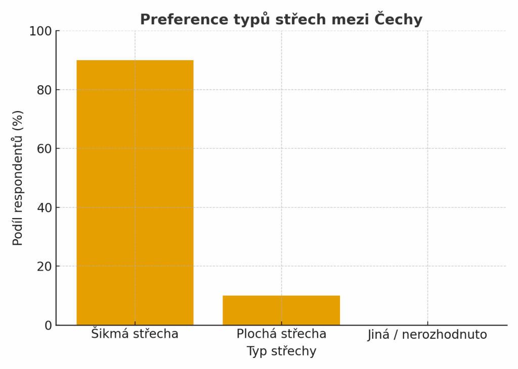 Prvním kritériem je tvar střechy. Češi jednoznačně preferují šikmé střechy – v posledních 5 letech je zvolilo 9 z 10 respondentů, kteří stavěli nebo rekonstruovali. Na tomto trendu se nic nemění ani do budoucna, kdy šikmou střechu plánují tři čtvrtiny těch, kteří se na stavbu nebo rekonstrukci chystají v příštích 3 letech. Šikmá střecha je pro rodinné domy nejen typická, ale i praktická, protože dobře odvádí srážky, a zároveň je vhodná do extrémních podnebných podmínek. Ideální krytinou pro šikmé střechy jsou střešní tašky, které se díky svému menšímu formátu snadno přizpůsobí i členitým tvarům a umožňují přesné a estetické provedení bez zbytečného odpadu. Montáž je tak rychlá, úsporná a v případě poškození lze jednoduše vyměnit jen jednotlivé kusy.