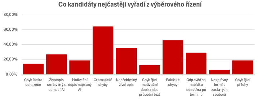 Firmy jsou zároveň výrazně přísnější při hodnocení kandidátů. Nejčastějším důvodem pro vyřazení jsou gramatické chyby v životopise (65 %), následované faktickými chybami, například nesprávně uvedeným názvem firmy (46 %) nebo nepřehledným zpracováním CV (35 %). Téměř třetina personalistů také negativně vnímá životopisy vytvořené s pomocí umělé inteligence.