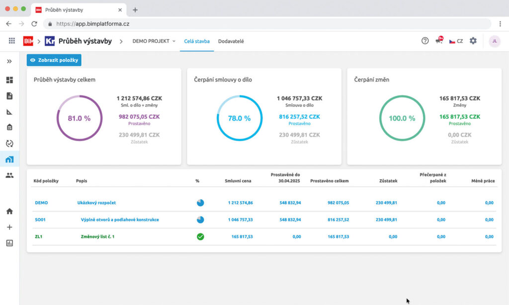 Zasmluvněný rozpočet se v průběhu realizace postupně odčerpává a slouží jako podklad pro změnové listy i vyhodnocení jejich dopadu. Sdílení dat i dokumentů je řízené a probíhá s jasně definovanými uživatelskými právy.