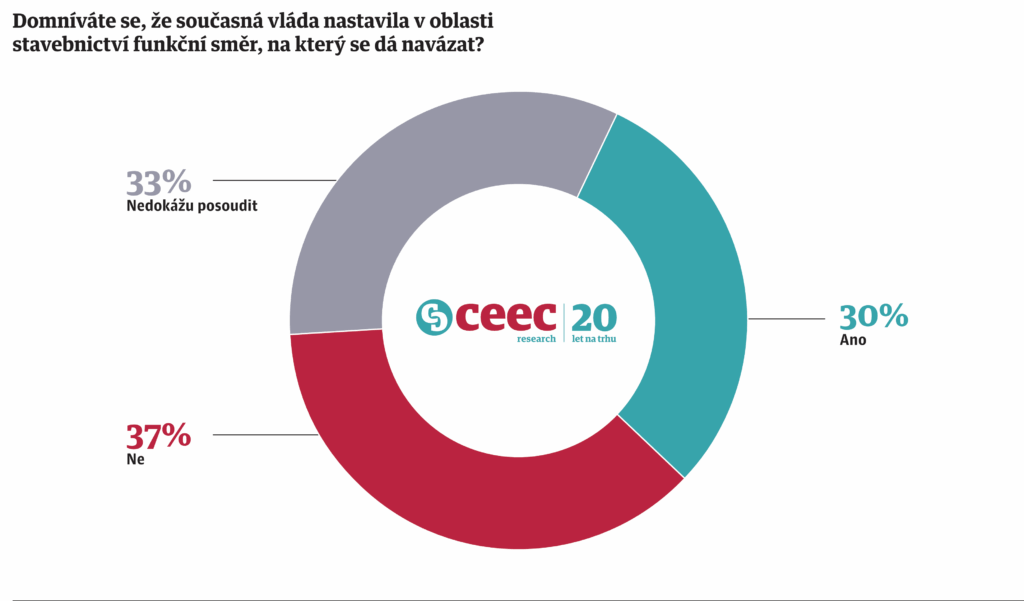 Stavební firmy jsou v pohledu na další směřování vládní politiky rozdělené. Necelá polovina (47 %) je přesvědčena, že nová vláda by měla zachovat současně nastavený kurz. Obávají se totiž rozsáhlých reforem, jejichž výsledek je nejistý a proces časově náročný. Dalších 43 % naopak očekává revizi a změny. Ukazují to výsledky nejnovějšího průzkumu společnosti CEEC Research, kterého se během září zúčastnilo 190 stavebních firem. Firmy nejlépe hodnotí přístup vlády k investicím do dopravní infrastruktury, naopak nejkritičtější jsou v oblasti digitalizace stavebního řízení. Celkově podle 37 % respondentů vláda nedokázala nastavit ve stavebnictví funkční směr.