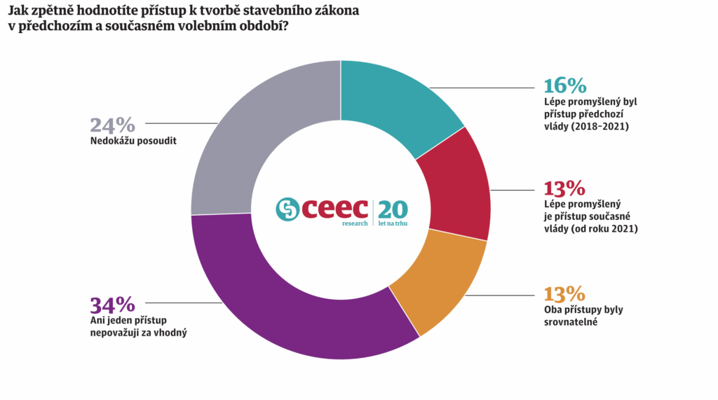 Na otázku, jak firmy hodnotí přístup k tvorbě stavebního zákona v minulém a současném volebním období, třetina respondentů (34 %) odpověděla, že nepovažuje za vhodný ani jeden z přístupů. Šestnáct procent firem označilo za lepší variantu stavební zákon připravovaný za vlády hnutí ANO ministryní Klárou Dostálovou, zatímco 13 % hodnotilo pozitivněji přístup současné vlády.