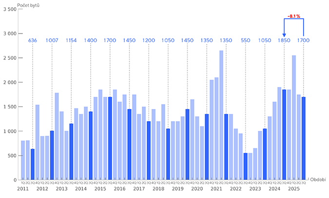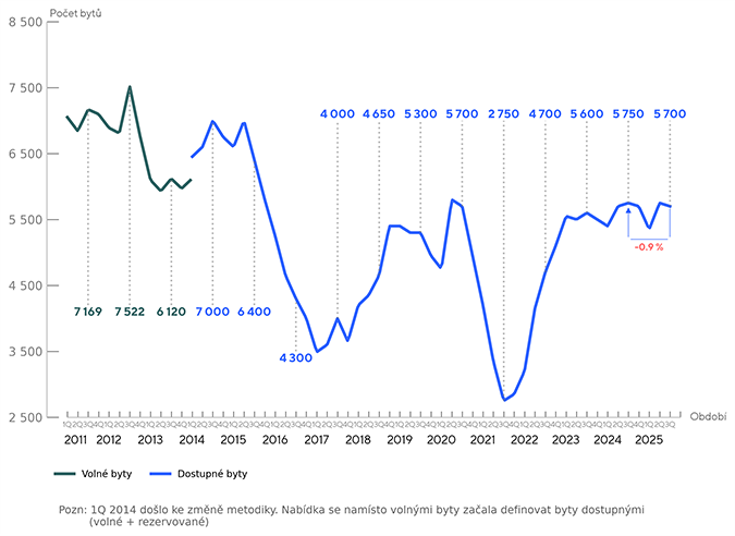 Koncem září bylo v Praze v nabídce 5700 nových bytů, což je téměř stejně jako před rokem (meziročně pokles o 50 bytů). Nejvyšší nabídka zůstává na Praze 9, která tvoří zhruba čtvrtinu trhu. Následují Praha 5 a 10, každá se zhruba 20 % podílem na počtu volných jednotek.