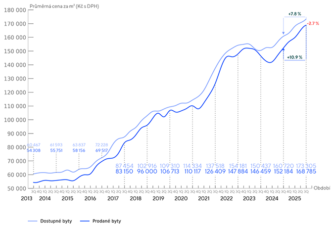 Během třetího letošního čtvrtletí nadále pokračoval i růst průměrných cen nových bytů, které tak opět dosáhly nových historických maxim. Průměrná nabídková cena se vyšplhala na 173 305 Kč/m², což představuje meziroční nárůst o 7,8 %. Podobný trend zaznamenal i průměr prodejních cen, který vzrostl na 168 785 Kč/m², meziročně o 10,9 %.
