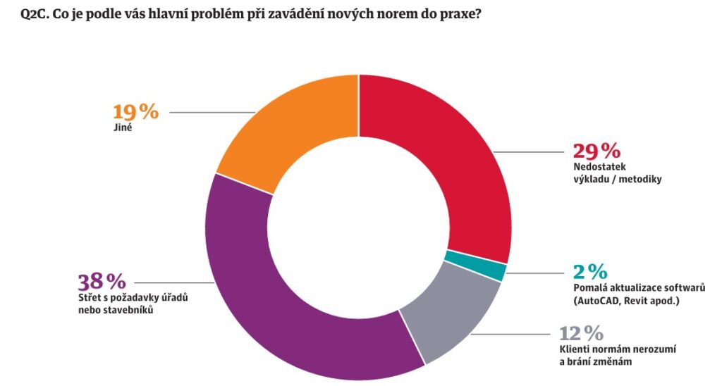 Téměř třetina firem (29 %) uvádí jako největší problém nedostatek jasného výkladu nebo metodiky, jak normy správně aplikovat v praxi. Dalších 38 % firem naráží na střet požadavků úřadů a stavebníků, což často vede k prodlužování projektové přípravy a opakovaným úpravám dokumentace.