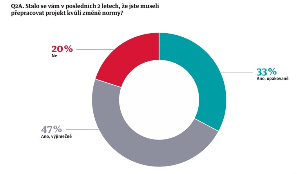 Plných 80 % projekčních firem muselo v posledních dvou letech přepracovat projekt kvůli změně normy. Nejčastěji se tyto změny týkaly požární bezpečnosti, kterou jako nejproblematičtější oblast označilo 60 % firem. V odpovědích pro více možností pak následovaly tepelné normy (42 %) a problematika elektromobility a parkování.
