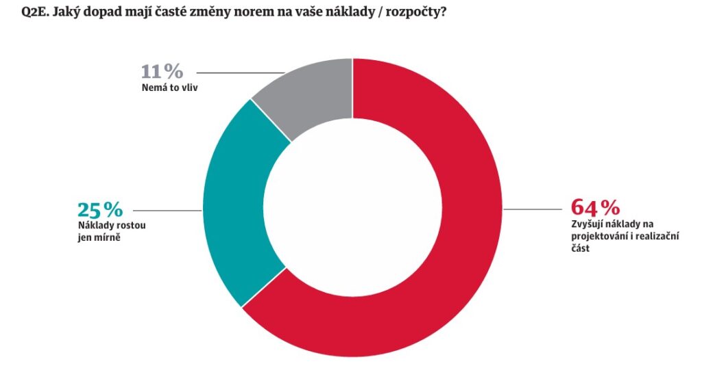 Změny technických norem mají podle většiny respondentů přímý dopad na cenu. 64 % projekčních firem uvádí, že změny norem zvyšují náklady jak na projektování, tak na samotnou realizaci, dalších 25 % hovoří o mírném nárůstu nákladů.