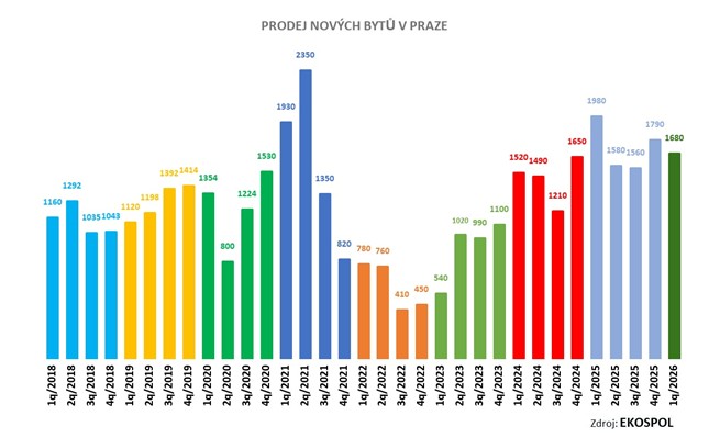 Zájem o nové byty na pražském trhu zůstává vysoký i na začátku letošního roku. Developeři během prvního čtvrtletí prodali v hlavním městě celkem 1680 nových bytů. To je sice v porovnání se stejným obdobím loňského roku o 15,15 procenta méně, loňské první čtvrtletí bylo ale rekordní. V porovnání s prvním čtvrtletím roku 2024 došlo letos k nárůstu prodejů o 10,5 procenta. Průměrná cena nového bytu v letošním prvním čtvrtletí meziročně vzrostla o 8,17 procenta. Vyplývá to z podrobných analýz společnosti Ekospol, která trh s novými byty v Praze monitoruje a prodejní data zveřejňuje už od roku 2007, tedy nejdéle ze všech subjektů na trhu.