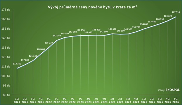 „Zásadní vliv na cenu nových bytů má nekončící zdražování stavebních prací i materiálu, které stále nepřestává. Naopak stavební materiály v poslední době vlivem konfliktu na Blízkém východě zdražují rychleji. Do cen nových bytů se promítlo také pomalé povolování nových staveb, kvůli kterému nedokáží developeři pružně reagovat na vysokou poptávku. Cenu zvyšují také stále přísnější energetické normy a další regulace. Žádný z těchto vlivů v nejbližší době jen tak nezmizí, ceny nových bytů v Praze proto budou růst i ve zbytku letošního roku. Otázkou jen je, jak moc. Očekávám, že to bude podobně jako loni,“ tvrdí developer Korec.