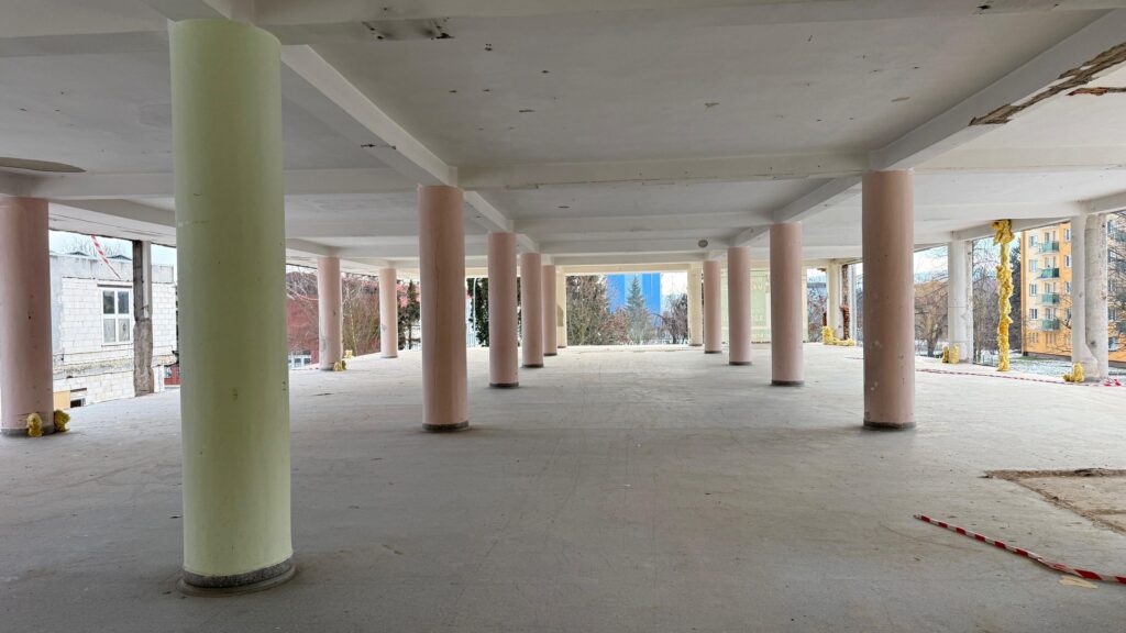 HSF System nyní realizuje stavební práce na druhém a třetím nadzemním podlaží. Probíhají úpravy konstrukcí, budování nových obvodových stěn a modernizace technického zázemí. Cílem je připravit budovu na další etapy výstavby a její nové využití.