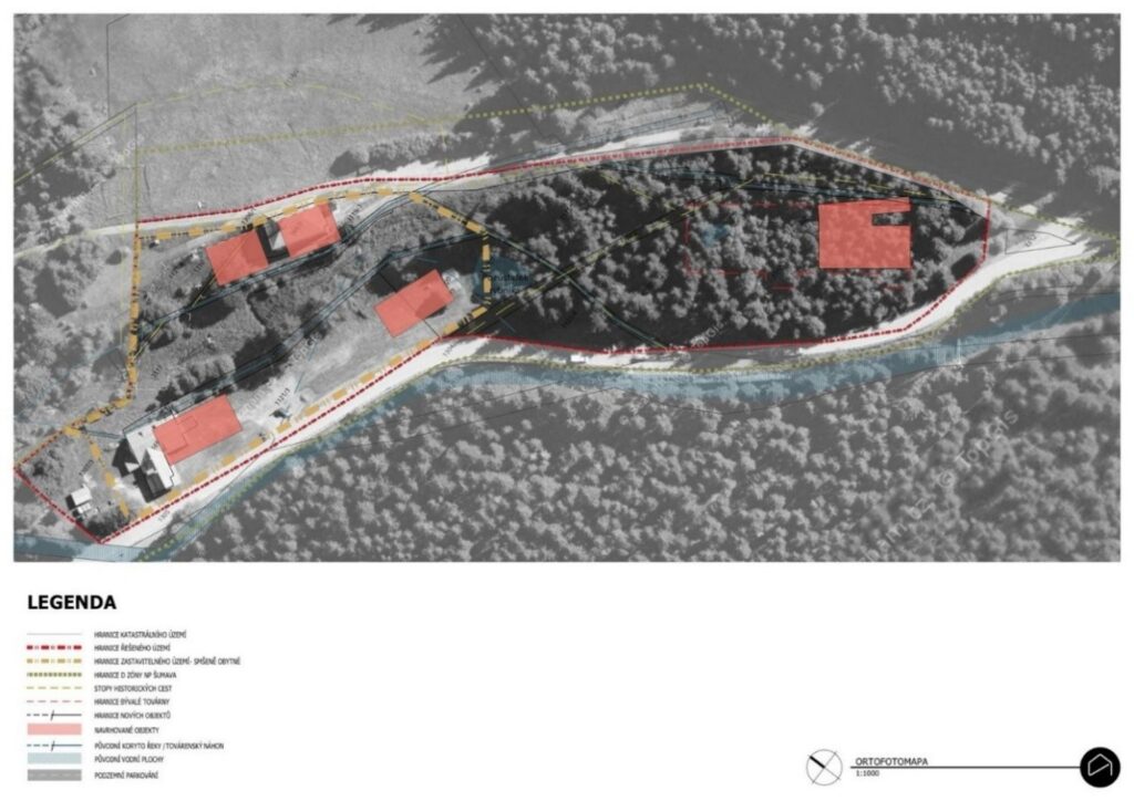 Součástí nabídky je i architektonická studie rozvoje z dílny ATELIER SAEM. Studie má dvě části – komorní koncept „Osady“ čítající 74 bytových jednotek a kulturní prvek v podobě „Papírny“ – objektem připomínající původní industriální areál. Ten zahrnuje muzeum, minipivovar a veřejný prostor, který by lokalitě vrátil společenský a historický rozměr. Důraz je kladen na šetrné zasazení do krajiny, podzemní parkování a kvalitu veřejných prostranství. Finální podoba architektonické studie bude předmětem projednání se správou Národního parku Šumava a dotčenými orgány.