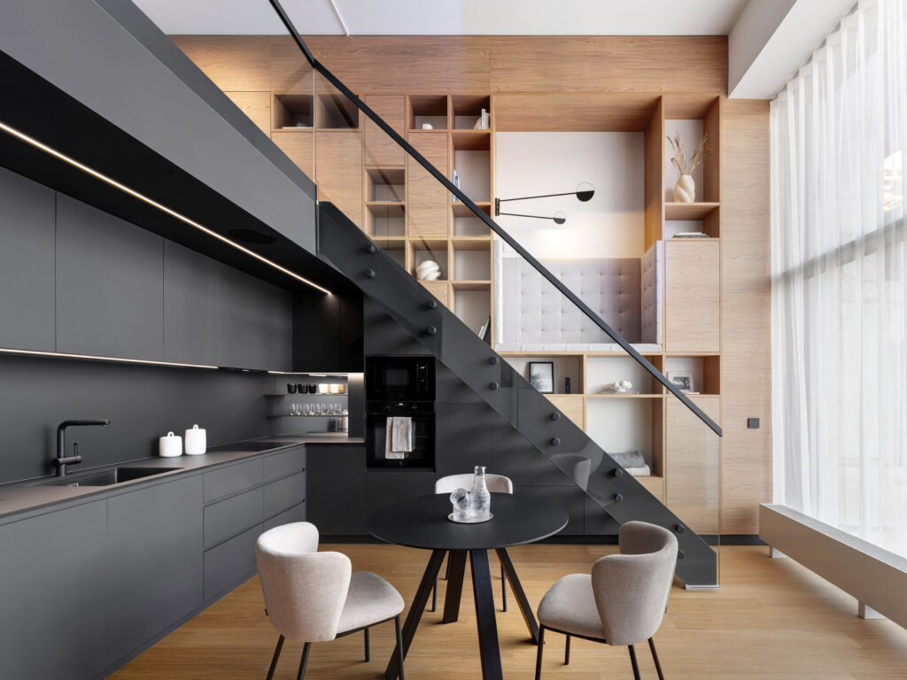 Dominantou prostoru je multifunkční vestavba na celou výšku bytu se skleněným schodištěm a výraznou obytnou stěnou, které společně vytvářejí neobvyklý prvek s čalouněnou sedací lavicí ve zvýšené úrovni, propojující úložné prostory, knihovnu i intimní místo pro odpočinek a čtení. V obývacím prostoru je kuchyň v matném antracitu s přímým vstupem do předzahrádky, která obytný prostor rozšiřuje zejména v teplejších měsících.