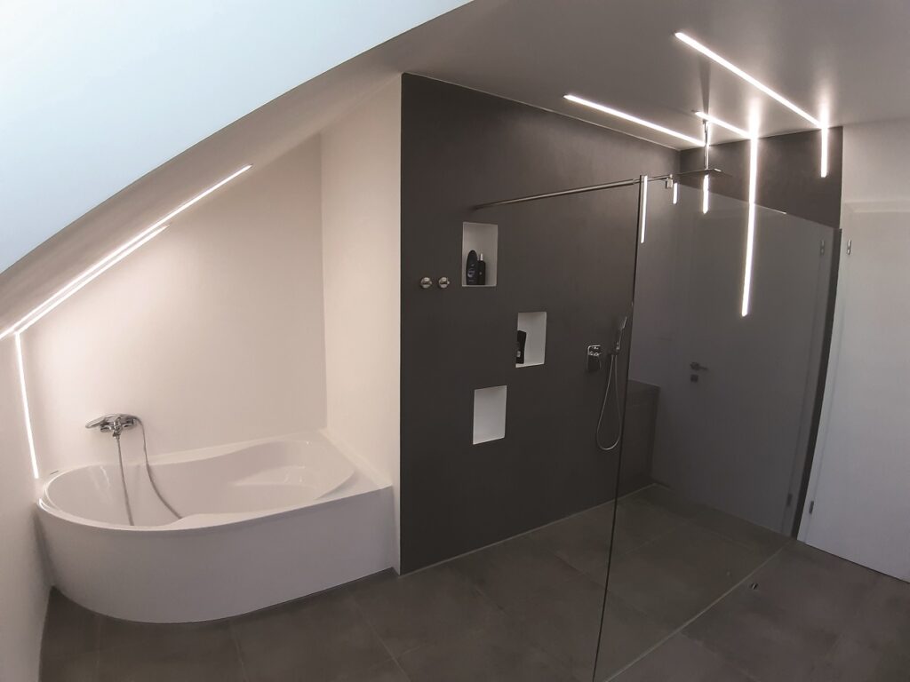 Prvním krokem realizace je celoplošná aplikace speciálního nátěru na hladké a nesavé podklady (např. AKRINOL Super Grip). Ten výrazně zvyšuje drsnost původního obkladu a dlažby, čímž garantuje spolehlivou adhezi s dalšími vrstvami bezespárového systému. Žádný problém nepředstavuje ani zabudované zrcadlo nebo integrované rohové lišty v obkladu. Adhezní můstek aplikujeme v plošné vrstvě i na tyto prvky a podklad je připraven k dalším krokům. Stejným způsobem lze AKRINOL Super Grip využít v dřevostavbách s OSB deskami, na které je možné bezespárový systém také aplikovat, nebo na sádrokarton a další hladké deskové materiály. Následně do všech rohů místnosti aplikujeme trvale elastické těsnící hydroizolační pásky a rohové komponenty (vnitřní i vnější rohy). Prostupy kolem baterií a odpadních potrubí ošetříme speciálními prostupovými manžetami. Stěny i podlahu poté celoplošně vyztužíme armovací mřížkou zapuštěnou do základní disperzní vodotěsné hmoty HYDROSOL Express 1K. Tímto krokem vzniká dokonale vodotěsná vana. Pokud je třeba, můžeme po vyschnutí tuto vrstvu jemně přebrousit nebo naopak převrstvit pro dosažení ideální rovinnosti. Následuje aplikace finálních dekorativních hydroizolačních stěrek v jimi zvoleném barevném tónu. Tuto vrstvu lze realizovat tzv. do hladka (smooth) anebo s povrchovou strukturou (topping).