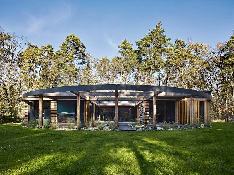 Hlavní výraz domu dodává pravoúhlý modřínový, pohledově přiznaný skelet s horizontálním ocelovým prstencem ve tvaru kruhu, který konstrukční rastr celé stavby uzavírá. Jeho přenesením na zem a následným vyplněním kameny s vegetací docílili architekti optické iluze kruhového domu. Prstenec tvoří dvanáct jednotlivých segmentů, které jsou k dřevěné konstrukci domu kotvené tak, aby měly dostatečnou dilataci pro jejich přirozený pohyb způsobený teplotními rozdíly v jednotlivých ročních obdobích.