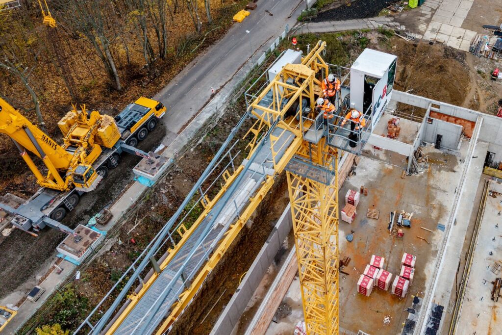 „Kvůli zajištění stání jeřábu byla nutná i úplná uzavírka přilehlé komunikace III/0138. Aby konstrukce unesla extrémní zatížení a byla zcela stabilní, vrtali jsme do skalního podloží. Kvůli svažitému terénu je zatížení jeřábu přenášeno prostřednictvím speciálně navržených železobetonových patek založených na sedmnáctimetrových mikropilotech. Jen montáž jeřábu trvala téměř dva dny. S tak mimořádnou délkou střešních panelů a sklonem terénu si mohl poradit jen největší jeřáb v Česku,“ říká Petr Lohniský, vedoucí projektu ze společnosti Metrostav CZ.
