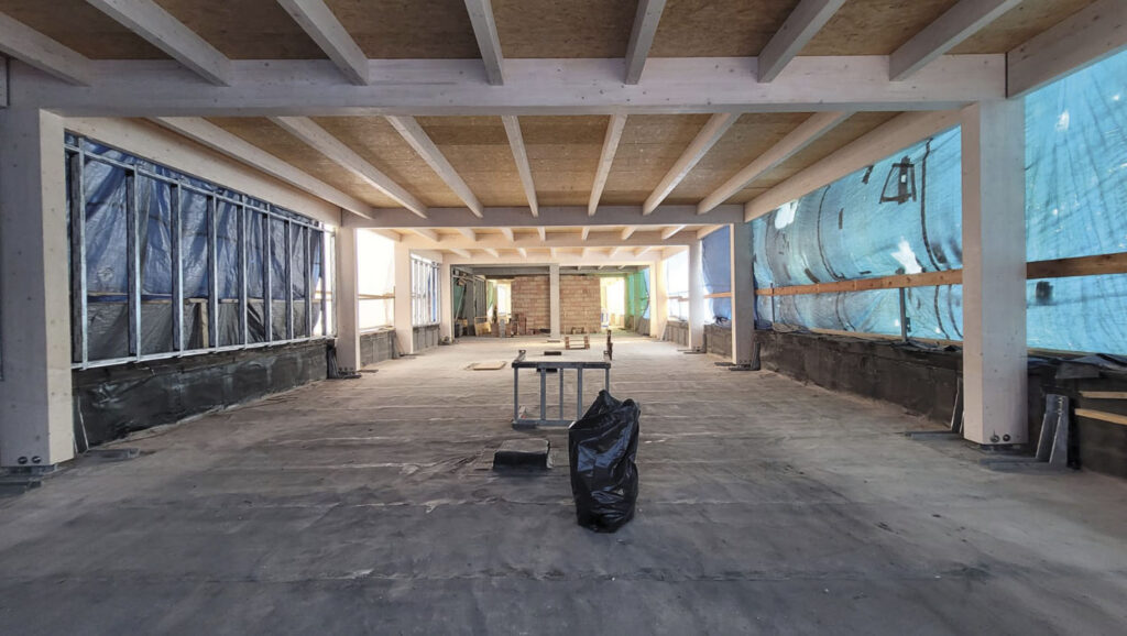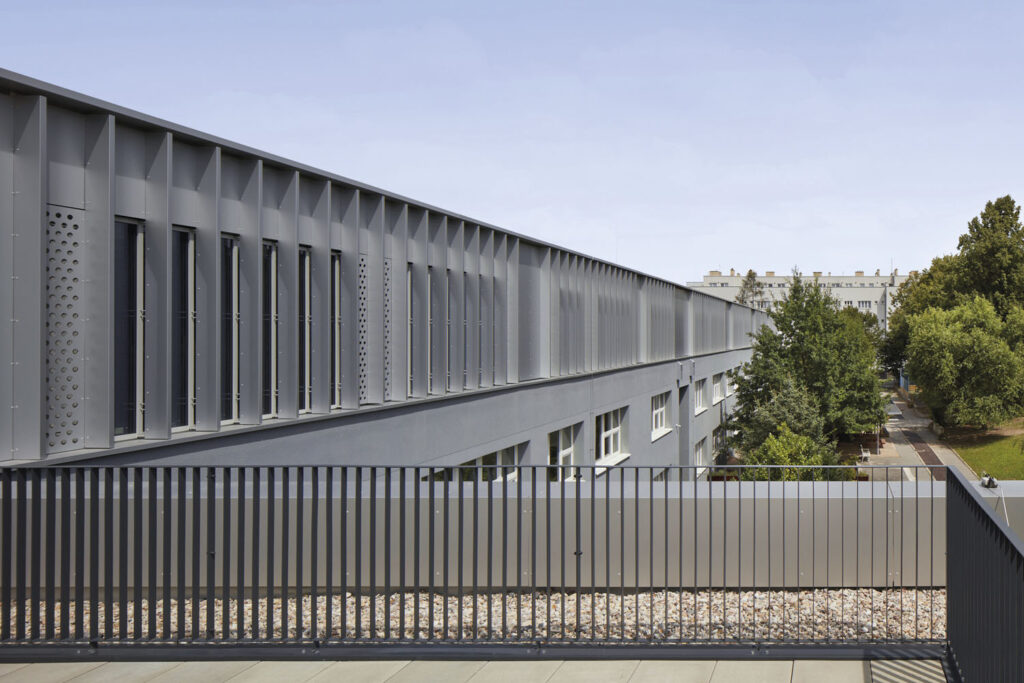 „Jednotlivé lepené nosníky se dovezly na stavbu a na zahradě školy se spojovaly do rámů, které se pak jeřábem osazovaly na stávající budovu. Spoje nosníků mohly být řešeny buď svorníky nebo kolíky. S ohledem na množství prvků a sjednocení vzhledu všech spojů – a také k přihlédnutí dekoru děrování u fasád a dřevěných desek jsme se rozhodli pro kolíky. Po osazení všech rámů a stropnic se pak dřevěné konstrukce tmelily a natíraly,“ uvádí Kateřina Havlová, hlavní architektka projektu.