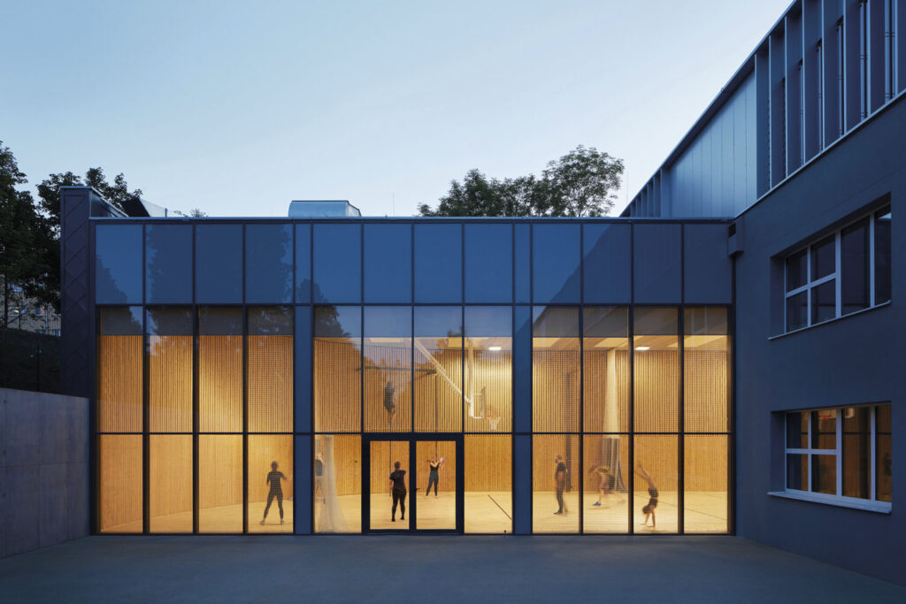 „Řešení akustiky bylo složité, ve třídách navíc komplikované tím, že tu jsou po obou stranách odrazivé prosklené plochy. S ohledem na skladbu stropní konstrukce jsme nemohli akustiku spočítat pomocí počítačových modelů, spíš jsme ji odhadovali. V tělocvičně byla stěna z dřevěných lamel ve spodní částí osazena hustěji tak, aby se mezi nimi nemohly zachytit prsty. Tato stěna přesto nebyla z hlediska akustiky dostačující, ostatní plochy jsou tu odrazivé, proto jsme ještě doplili akustické desky na stropě. Dle výpočtu jsou osazeny v minimální možné míře, takže mohl být přiznán železobetonový strop,“ vzpomíná Kateřina Havlová.