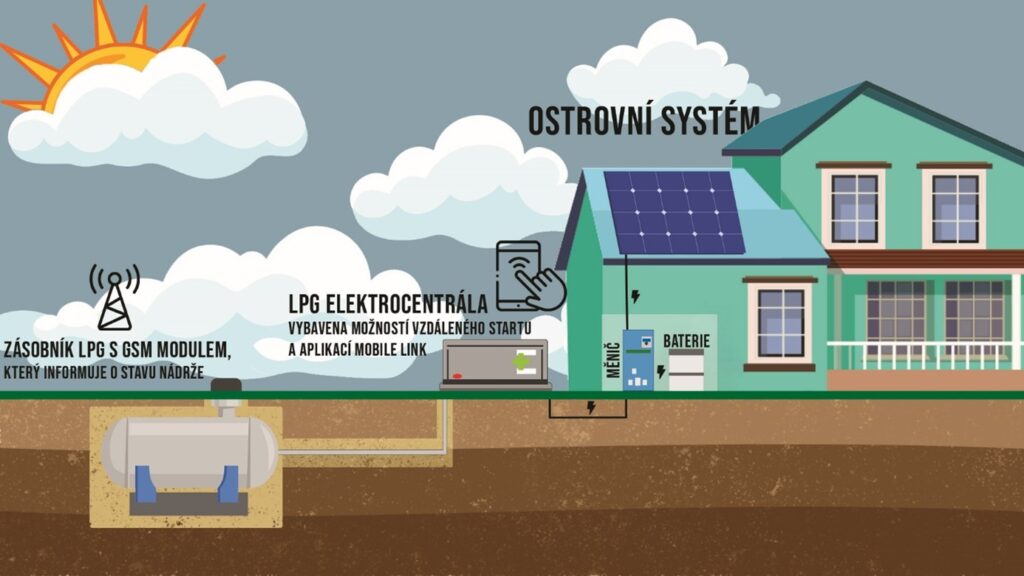 Některé projekty však jdou ještě dál, a kromě zajištění vytápění, ohřevu vody a vaření lze využít kapalný propan v zásobníku rovněž jako palivo pro záložní zdroj energie v ostrovním systému. Plynová elektrocentrála totiž ušetří 20 až 30 % nákladů na palivo ve srovnání s dieselovými stroji. Jde přitom o výkonné kompaktní zařízení s podobnou velikostí i umístěním jako venkovní jednotka tepelného čerpadla typu vzduch-voda, které funguje plně automaticky a je vybaveno možností vzdáleného startu. „Inteligentní plynová elektrocentrála udrží solární systém plně funkční i v zimním období. Generátor je v případě potřeby – FVE nestíhá dobíjet baterie – aktivován signálem z bateriového úložiště a plný výkon dodává v rámci desítek vteřin,“ popisuje Jakub Koníček ze společnosti Solforen, která se specializuje na off-grid řešení.