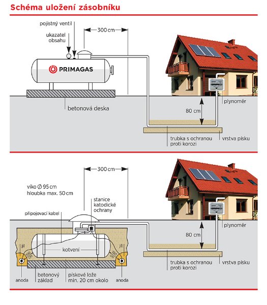 I v případě propanového zásobníku od dodavatele je totiž třeba počítat s investicí více než 80 tisíc korun, vč. DPH. Vyplývá to z kalkulace společnosti Primagas pro rodinný dům s vytápěnou plochou mezi jedním a dvěma sty metry čtverečními. Kalkulace zahrnuje vše až po kotel – tedy zejména projektovou dokumentaci i poplatek za povolení tzv. jednoduché stavby, dále napojení zásobníku a plynové potrubí i dopravu a ukotvení zásobníku.