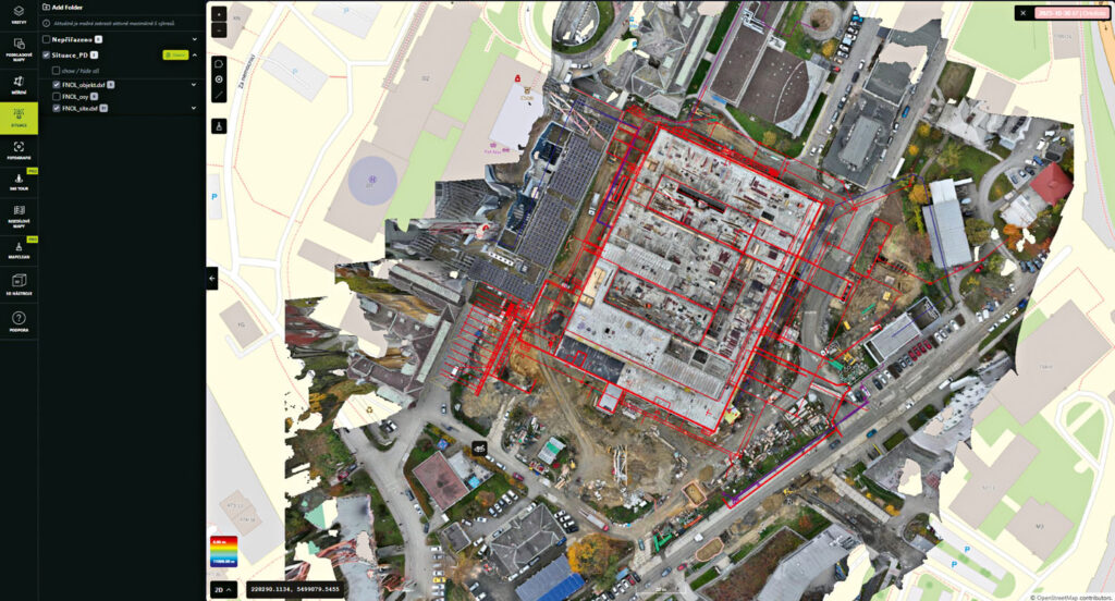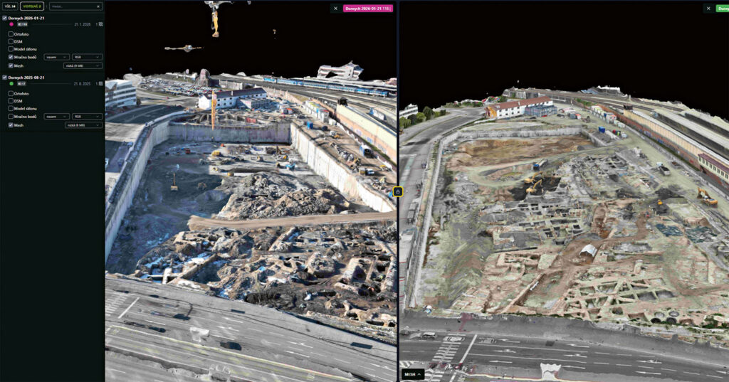 Pro plánování a kontrolu postupu výkopových prací používáme online software, který zpracuje data z dronu pomocí fotogrametrie a vytvoří výstup v podobě: ortofoto snímek území, 3D zjednodušený model (Mesh), 3D mračno bodů (Point Cloud). Umožňuje také další práci s těmito daty v online prostředí podobném AutoCADu s jednotlivými vrstvami náletů, porovnání 2–4 snímků z různých období a měření délek, objemů, ploch, výškových profilů a dokáže také porovnávat jednotlivá data mezi sebou, a tak detailně kontrolovat postup výkopových prací. Pro vyšší přesnost lze použít vlícovací body (GCP) s georeferencováním do S-JTSK.