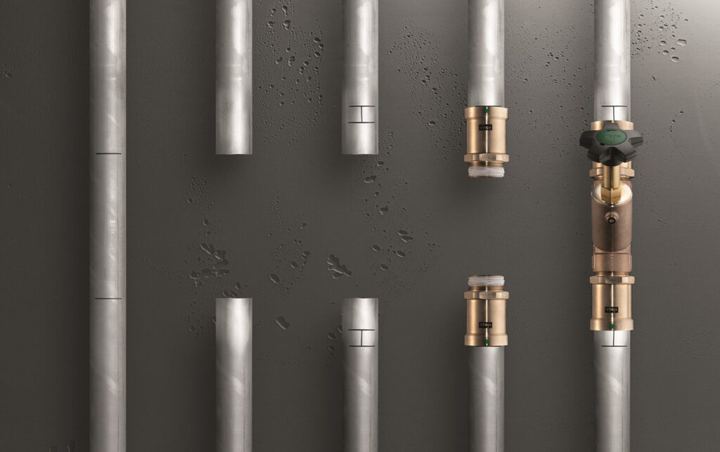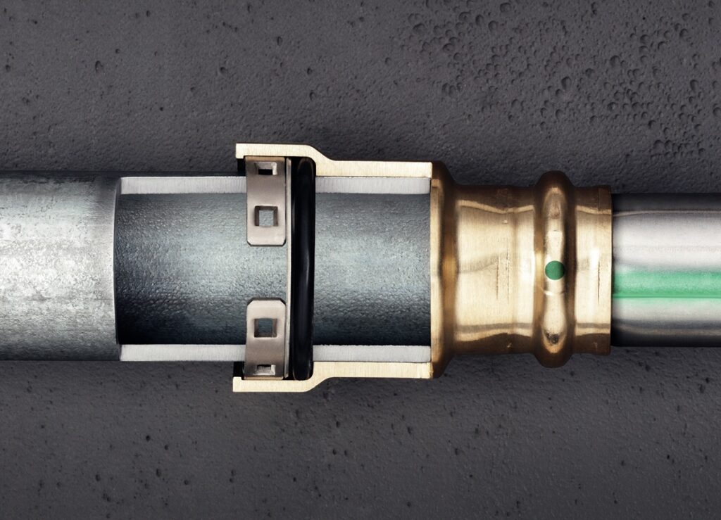 Komponenty jsou snadno rozpoznatelné díky zelenému bodu a nálepce „zalisováno“, která potvrzuje správné provedení spoje. Integrovaný těsnicí prvek z EPDM byl speciálně navržen pro pitnou vodu a zajišťuje maximální hygienickou bezpečnost.
