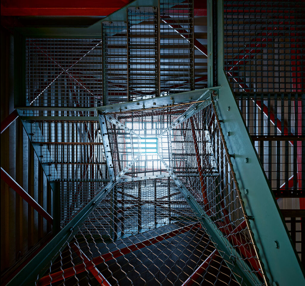 Schodiště tvoří obvodové ocelové schodnice z plechu, mezi něž byly vloženy stupně a podesty z pororoštu. Ukončeno je vícestupňovou vyhlídkovou plošinou. Rozdílné výšky a úrovně plošiny umožňují výhledy na všechny světové strany a umožňují sezení.