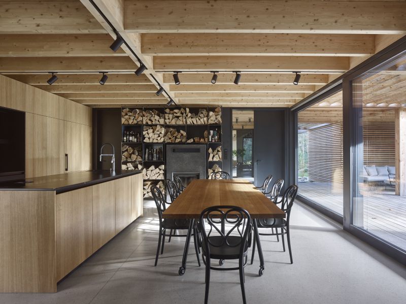 Samotný prostor kuchyně harmonicky zapadá do jednoduchého konceptu celého interiéru. Působí nenápadným, minimalistickým dojmem. Přestože využívá nejmodernějších technologií špičkových výrobců, jakými jsou například Miele a Bora, zbytečně na sebe nijak neupozorňuje. To umožňují kuchyňská dvířka, která lze zalomit do vnitřního prostoru kuchyně, čímž se celý její prostor otevře. V případě potřeby je ale možné zase vše jednoduše pohledově uzavřít. Po pravé straně kuchyňského koutu se nachází nosná ocelová konstrukce pro uskladnění dřeva, jejíž součástí je i samotný krb. Za krbem je schovaný prostor, který majitelům slouží současně jako sklad a technická místnost.