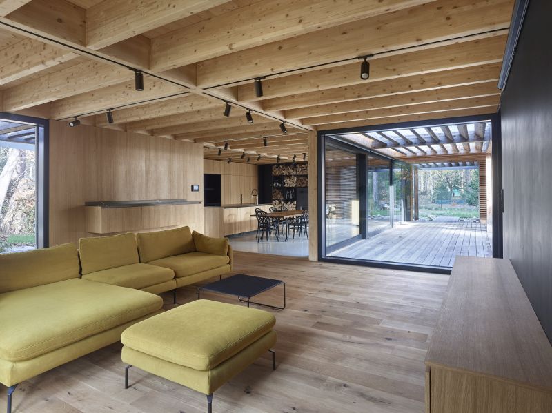 Majitelé už za sebou měli osobní zkušenost se stavbou svého prvního domu, takže přesně věděli, co od nového bydlení očekávají. Zásadní vliv na hlavní dispoziční rozvržení domu mělo jedno z jejich přání – vytvořit samostatný prostor pro jejich dcery s rodinami, které je pravidelně navštěvují. Z tohoto důvodu je dřevostavba tvořená dvěma na sobě nezávislými obytnými jednotkami, které využívají společné polouzavřené atrium. Spojuje je také plochá, zateplená střecha, jejíž sklon směřuje do odtokových žlabů vedoucích do zásobníku na dešťovou vodu. Na ní je umístěna technologie fotovoltaiky, která zachycuje sluneční paprsky procházející korunami stromů.