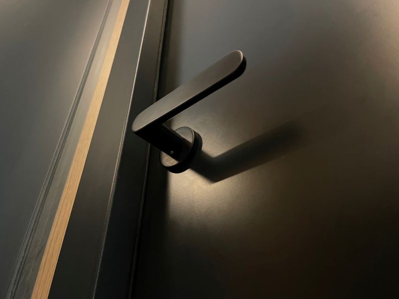 „Po kování značky M&T saháme často, filozofie a koncepce značky je nám sympatická. Design řady NOVA nám přijde funkční, minimalistický, stává se přirozeně součástí komplexního organismu domu,“ shodují se architekti. „Dveřní kování NOVA je vyrobené z nerezové oceli, která klikám dodává vysokou pevnost a mechanickou odolnost. Navíc na ní perfektně drží titanový povrch, který je v této realizaci v matném černém provedení,“ informuje Roman Ulich, hlavní designér české rodinné manufaktury M&T. Kliky NOVA jsou v této realizaci doplněné kulatými rozetami s oddělenými spodními rozetami se zámky. „Pokud je to možné, tento typ kování v projektech rádi používáme. Je to detail, který je nejen velmi elegantní, ale i naprosto stejně funkční jako rozeta v celku, kterou vidíme všude kolem. Je pro nás důležité, aby kování působilo s dveřním křídlem ve vzájemné synergii jako harmonický celek,“ dodávají architekti.