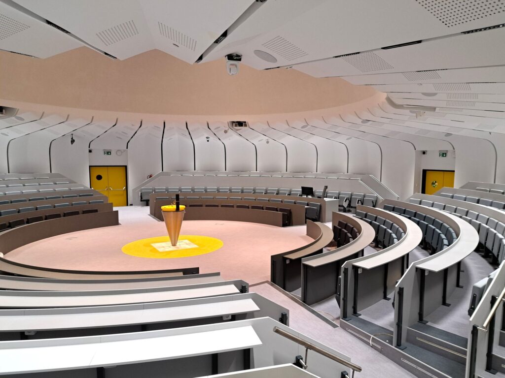 Na vnitřní užitkové ploše cca 7 300 m² vzniklo špičkové prostředí pro výuku i společné setkávání studentů a pedagogů. Srdcem budovy je kruhová aula s kapacitou 378 míst. V prvním nadzemním podlaží se nachází menza, která denně vyrobí a vydá jídla až pro 2 500 strávníků, dále praktické učebny a laboratoře zubního lékařství. Vyšší patra patří teoretické i praktické výuce Lékařské fakulty a Fakulty zdravotních věd, včetně specializovaných učeben se simulátory a dalšími moderními pomůckami pro výuku.