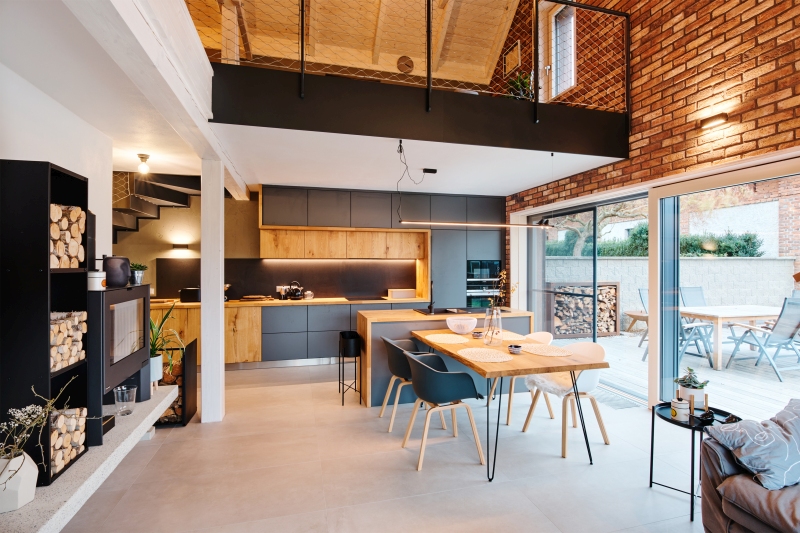 OTEVŘENÝ INTERIÉR S CIHLOVOU ŠTÍTOVOU STĚNOU
