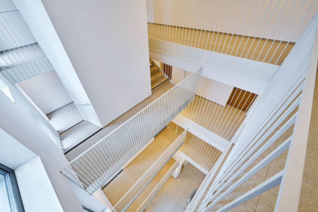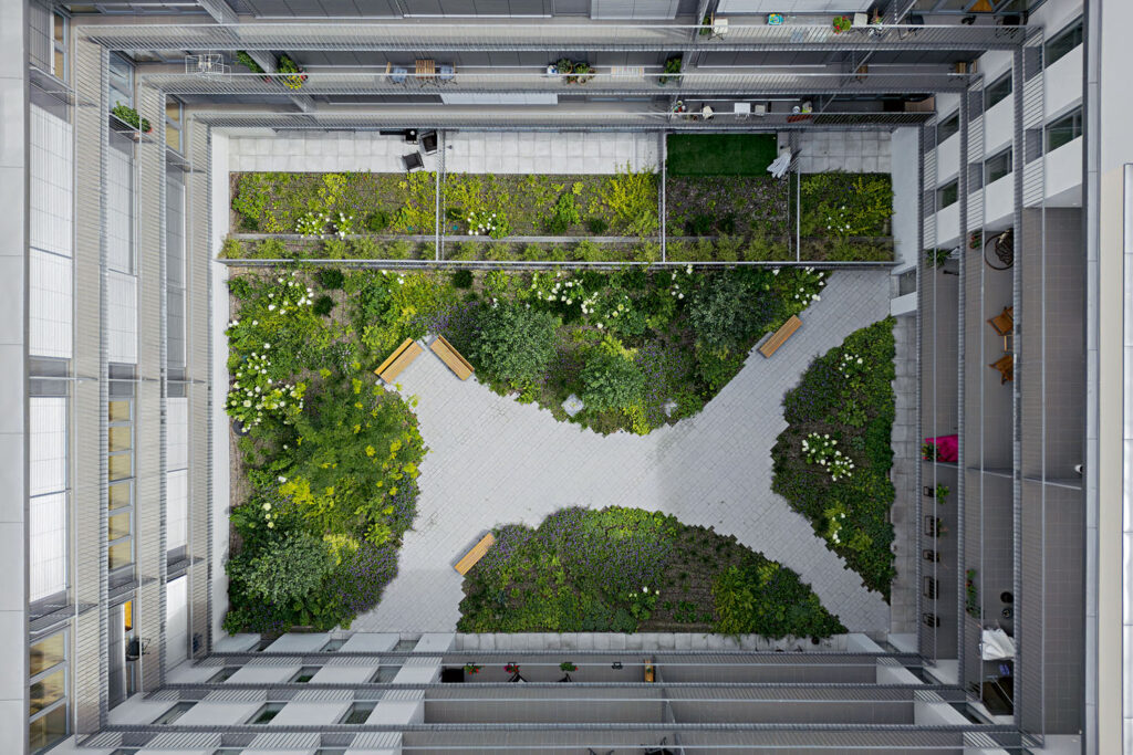 Blok působí dostatečně jednolitě, má pět vstupů k pěti komunikačním jádrům, ovšem zvenku je členěn více. Jako by měl čtyři nároží o různých výškách a mezi nimi čtyři spojovací části, které jsou nižší. Jako by byl dělen do více domů. Dává to najevo i okny s různými výškami, šířkami, někde to jsou francouzská okna, někde jen okna s mírně sníženým parapetem, někde lodžie a někde balkony, vše sjednocuje stejně lehké kovové zábradlí. Vnitroblok je zahradní, dělený do různých výšek, podle výšky domů, uprostřed je společná odpočinková zahrada, zahrady se nacházejí také na částech nejvyšších úrovní střech.