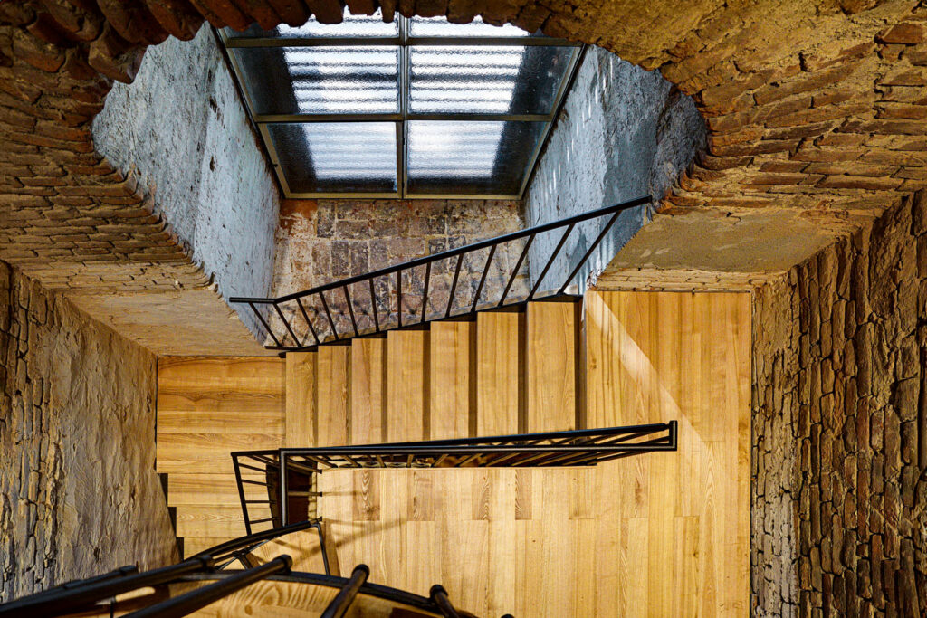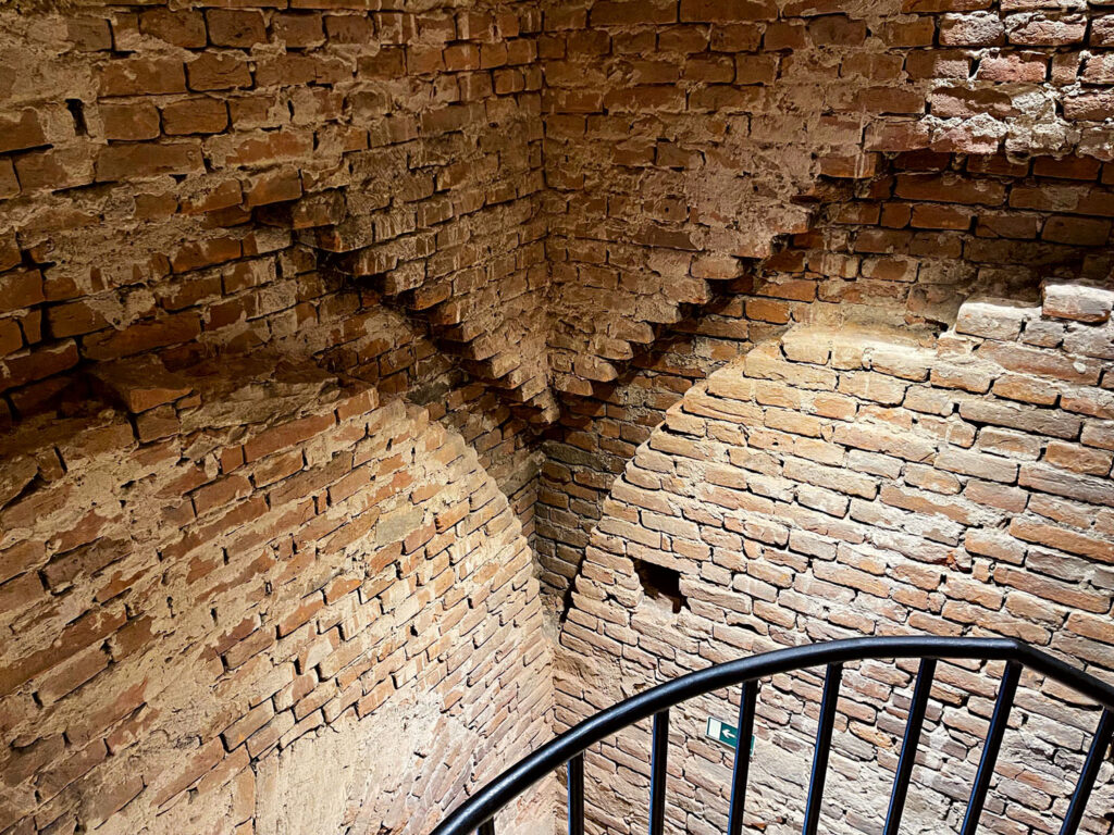 Na začátku jsou pohodlné dvouramenné schody, zcela nové, s ocelovou konstrukcí, které nahradily staré a již nevyhovující. Jenomže pak se schodiště zcela promění. Odpoutá se od stěn a spirálovitě se vine vzhůru. Točité schodiště se volně vine kolem vřetena z ocelové trubky prostorem uprostřed věže. A tím poskytuje možnost sledovat, co všechno věž v průběhu času potkalo, kde byly kdysi klenby a kde bylo rozetové okno, kde se měnil způsob stavění a kde zbyly nějaké kapsy po vybouraném. Sledovat lze i to, jak se průběžně opravovalo, jak se měnily cihly – je to stavebně hodně zajímavý zážitek. Jenomže to nejzajímavější je tam, kde se ze schodiště vstupuje do podkroví.