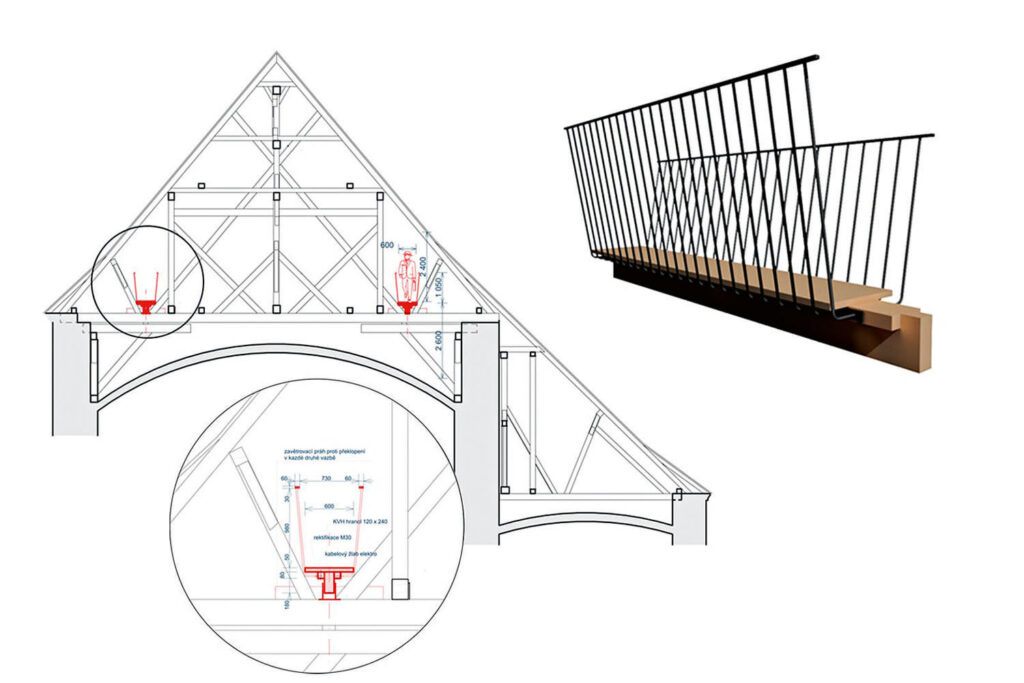 Najednou se před očima otevře ojedinělý prostor, dřevěná konstrukce ne zcela obvyklé vazby s robustními kříži, pod kterou se měkce vlní rub klenby dolní části kostela. Je to dech beroucí, je to prostě krásné. Je to plastika, jíž lze procházet a ve které se historie nečekaně spojuje s dnešním cítěním. Krov je původní zrekonstruovaný, nově jsou do něj vložené lávky. Místa tu nebylo mnoho, a také nebylo žádoucí příliš narušit existující prostor, proto jsou lávky úzké, opatřené tyčovým ocelovým zábradlím (aby bylo jasné, že jde o nově vložený prvek). Prostor mezi zábradlím se směrem vzhůru rozšiřuje, aby nevznikl dojem stísněnosti. A zároveň to odpovídá tvarům krovu. Je tu vytvořen okruh, aby nebylo nutno chodit tam a zpátky, ale aby se dala obejít celá konstrukce, aby se dalo také vstoupit do prostoru nad presbytářem, kde je trochu více volného prostoru (využitého k netradiční, historickým uměleckým dílem inspirované instalaci).