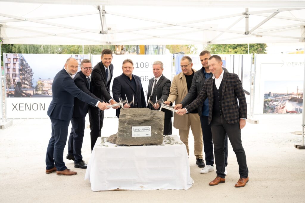 Na fotografii (zleva): Petr Pospíšil, ředitel PSN Brno, Lukáš Srch, projektový manažer PSN, Štěpán Smrčka, ředitel developmentu PSN, René Černý, radní pro oblast investic a první náměstek primátorky, Vojtěch Mencl, starosta městské části Brno-střed, Martin Krupauer, architekt ze studia A8000, David Kostelecký, olympionik, Karel Volf, generální ředitel Metrostav DIZ